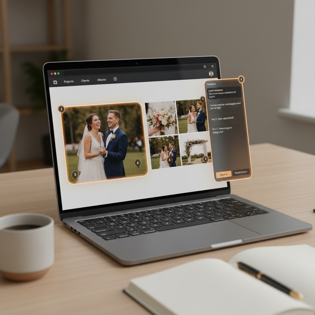 Your clients click directly on the album page to leave pinpoint comments — like Figma annotations. No more “the third photo on page five” confusion. Every comment is linked to an exact spot.
